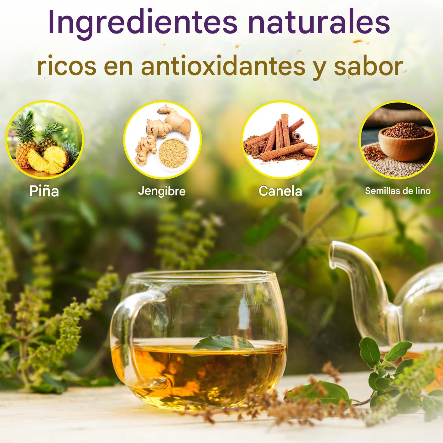 Transforma tu digestión y recupera tu bienestar con el poder combinado del Jengibre, Piña, Linaza y Canela. ¡La fórmula perfecta para desinflamar, desintoxicar y sentirte increíble!